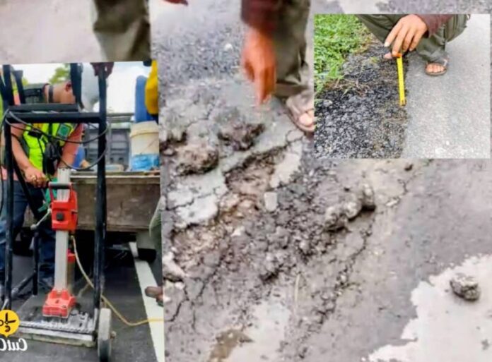 Ditemukan, ketebalan aspal sangat tipis yang berukuran sekitar 3 hingga 4 cm, bahkan ditemukan 2,5 CM. Padahal menurut RAB menurut pelaksana CV ABK, Zulprianto, panjang 400 meter, lebar 3,5 meter, tebal 6 hingga 7 cm. (Tim/Red)