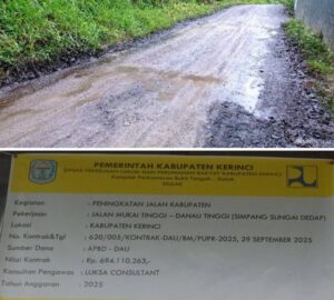 Siasatinfo.co.id, Berita Kerinci – Aneh, pembangunan konstruksi jalan aspal jenis hotmix link Desa Mukai Tinggi – Danau Tinggi (Simpang Sungai Dedap) dikerjakan CV. Abbiyu Bangun Konstruksi dikerjakan Yuldi Herman dengan pelaksana lapangan Zulfrianto.