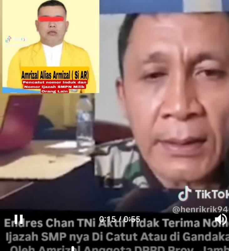 Endres Chan TNI aktif tidak terima nomor Ijazah SMP nya dicatut atau digandakan oleh Amrizal Anggota DPRD Provinsi Jambi dari Partai Golkar Dapil Kerinci – Sungai Penuh.