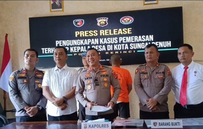 Siasatinfo.co.id, Berita Kerinci – Kapolres Kerinci AKBP Arya Tesa Brahmana, S.I.K, pimpin langsung Konferensi Pers terhadap tersangka kasus pemerasan terhadap oknum Kades Desa Pelayang Raya, Kota Sungai Penuh yang sempat viral dan menggegerkan Publik.