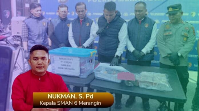 Eks Kepsek SMAN 6 Merangin Nukman beserta 3 orang kroninya berujung menjadi tersangka dari Polres Merangin. Kasus ini agar menjadi contoh bagi para Kepsek SMA di Provinsi Jambi agar tidak makan uang haram milik Siswa-siswi di sekolah yang mereka pimpin.