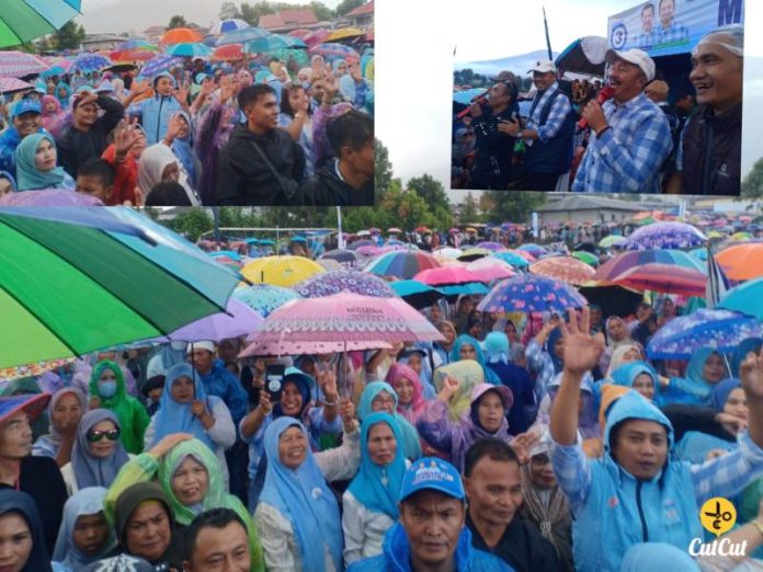 Tampak para ribuan massa pendukung Monadi-Murison tanpa surut sedikit pun tetap bertahan dilokasi walau diterpa hujan rinyai.